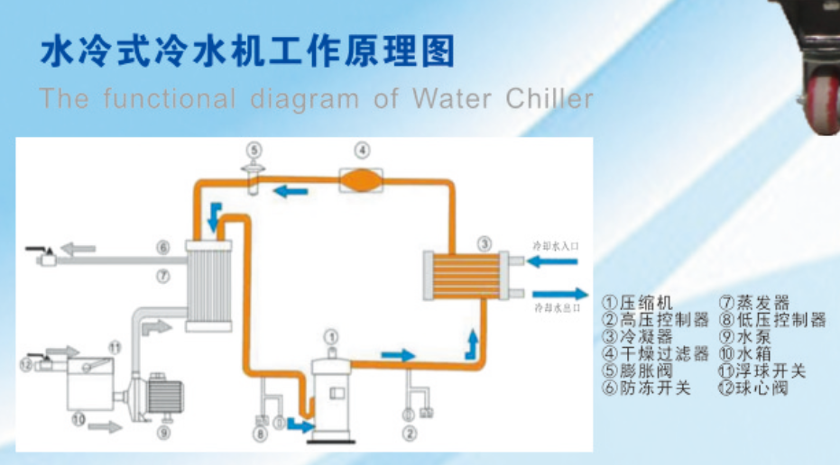 制冷剂循环系统:蒸发器中的液态制冷剂吸收水中的热量并开始蒸发制冷剂与水之间形成的温度差,液态制冷剂亦蒸发变为气态,后被压缩机吸入并压缩(压力和温度增加),气态制冷剂通过冷凝器(风冷/水冷)吸收热量,凝结成液体,通过膨胀阀(或毛细管)节流后变成低温低压制冷剂进入蒸发器,完成制冷剂循环过程.