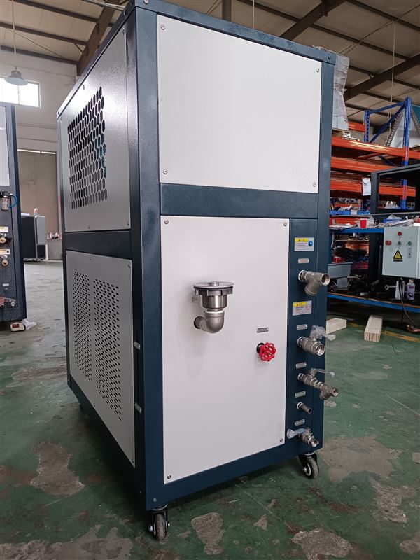 3匹标准风冷式冷水机 小型冷冻机 冰水机厂家安装和移动非常方便.但是它对工作环境要求较高,首先,因为它是以热风循环来制冷的,所以,如果安装车间的通风效果不好的话,会直接影响到冷水机的制冷效果.另外,如果您想把冷水机放在有湿度要求的无尘车间里的话,那么我劝您改装水冷的.因为风冷冷水机,会在机顶喷出水蒸气以散热。